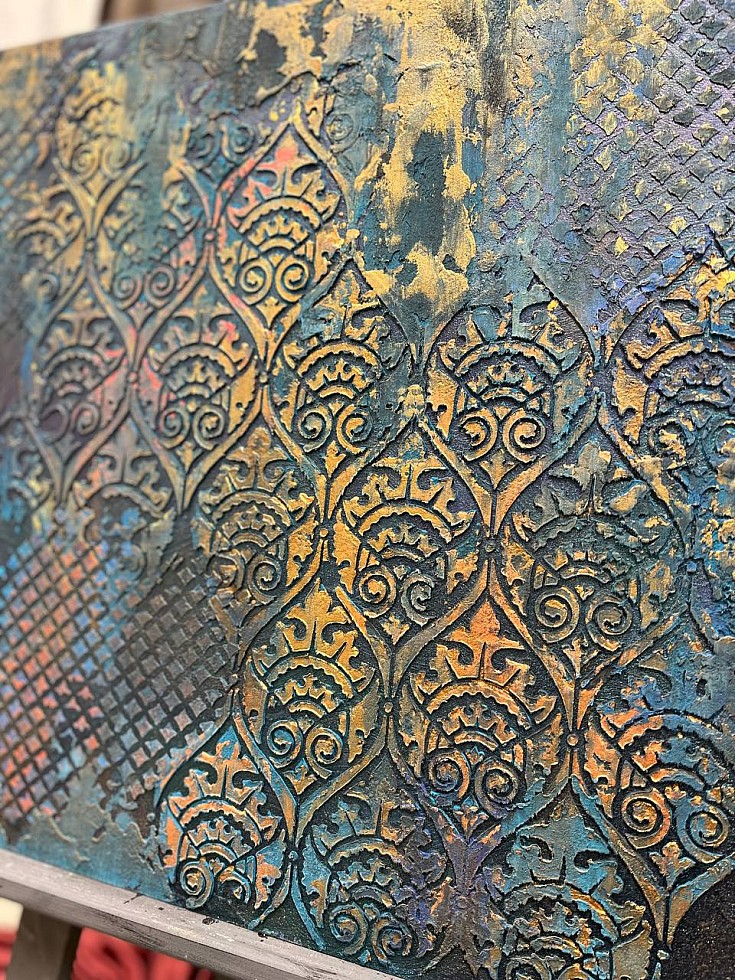 В прорези этого универсального инструмента удобно наносить краску различными способами: спонжем, круглой кистью или аэрографом. Трафарет легко вдавливается в глину, а также подходит для декоративной штукатурки. Для нанесения акриловых фактурных гелей наилучшим способом является использование шпателя, который также удобно использовать для удаления излишков краски без повреждения трафарета.
